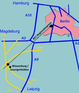 Eine Stunde aus allen RichtungenDas Ferienhaus liegt ca. 1 Stunde von Berlin entfernt. Aber auch von Leipzig oder Magdeburg ist man nicht länger unterwegs. Per Bahn ist es mit dem Regional Express / Bahnhof Wiesenburg erreichbar. Abholung müsste organisiert werden.